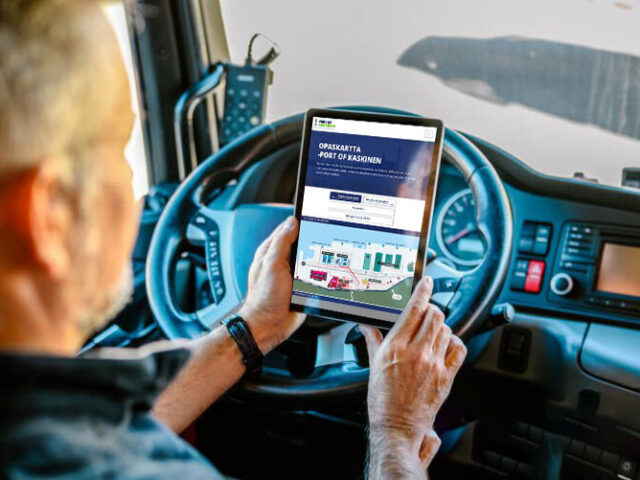 Maaliikenteen puolella tunnistettiin konkreettinen arjen haaste: satamaan saapuvat rekat tarvitsivat selkeitä ajo-ohjeita. Ratkaisuksi doop suunnitteli ja toteutti maaliikennesovelluksen, jossa kuljettaja syöttää tiedot lastistaan, ja sovellus ohjaa perille 3D-kuvien avulla näyttäen myös, miltä määränpää satama-alueella näyttää.